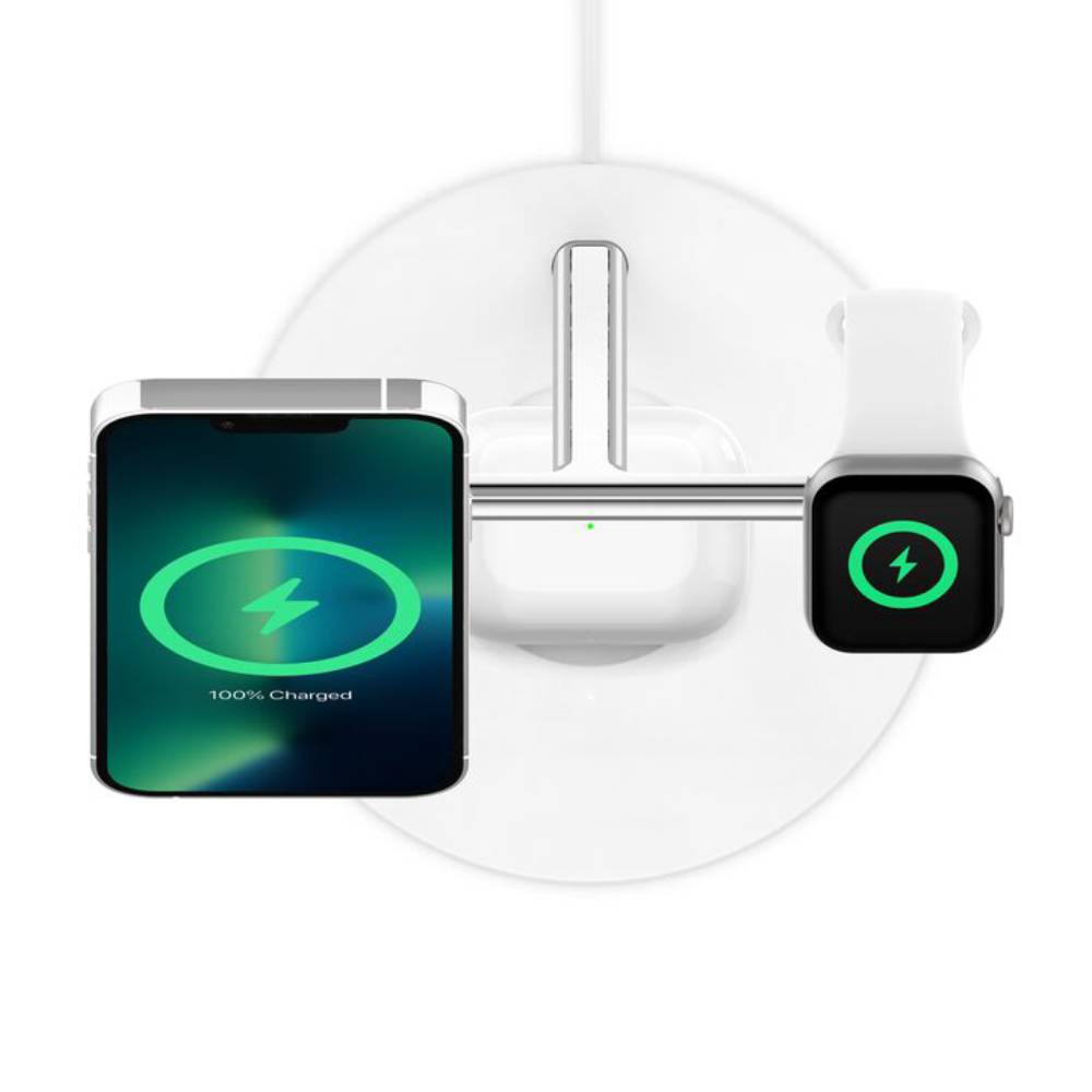 Con esta base de carga inalámbrico, podés cargar simultáneamente tu iPhone, Apple Watch y AirPods. Gracias a la potencia de hasta 15 W, obtendrás una carga ultrarrápida para tu iPhone, mientras que el Apple Watch Series 7 se carga hasta un 33 % más rápido. Su soporte magnético permite colocar el iPhone en cualquier orientación, ideal para usar la función En Reposo mientras se carga.