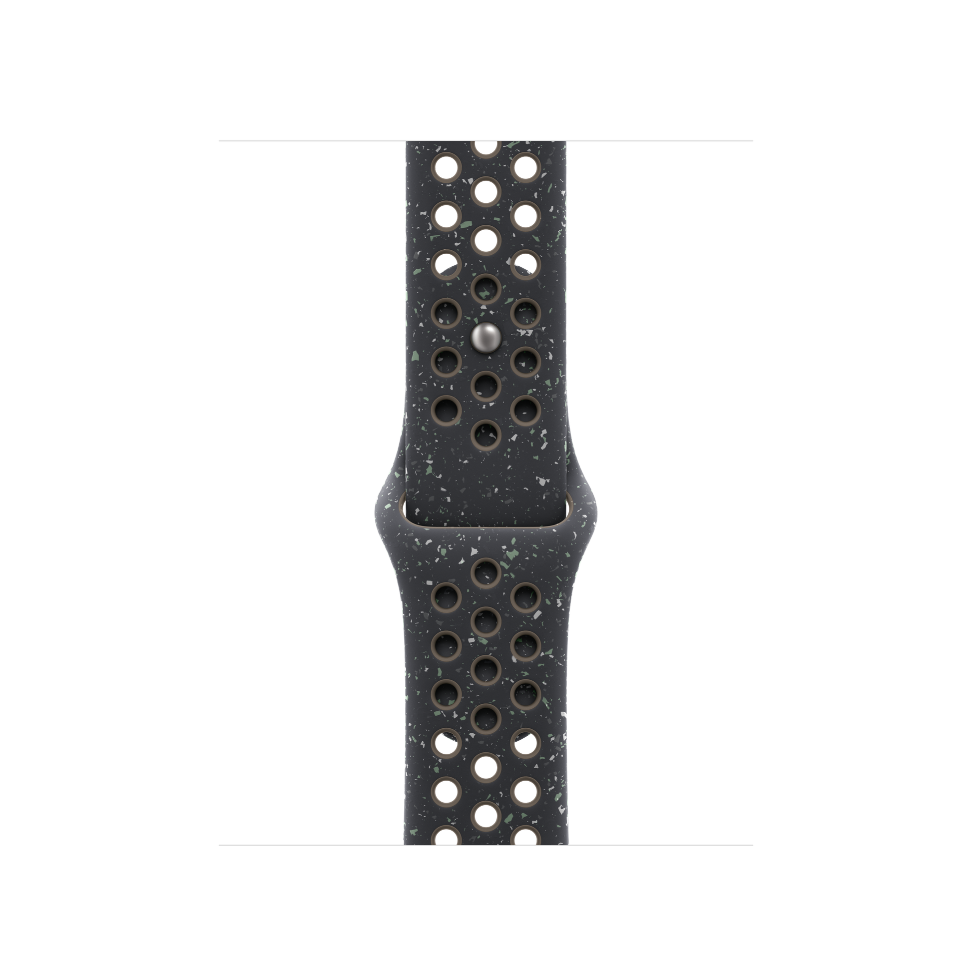 La correa Nike Sport es resistente y suave a la vez. Además, es transpirable gracias a sus perforaciones hechas por compresión. Incluye fragmentos de distintos colores que se combinan de forma aleatoria para crear un diseño jaspeado único. Este material es flexible, agradable al tacto y se adapta con elegancia a tu muñeca. Su nuevo cierre de clip de aluminio da al pasador un elegante acabado mate. La correa contiene al menos un 32 % de fluoroelastómero reciclado y las motas del jaspeado, al menos un 66 %.