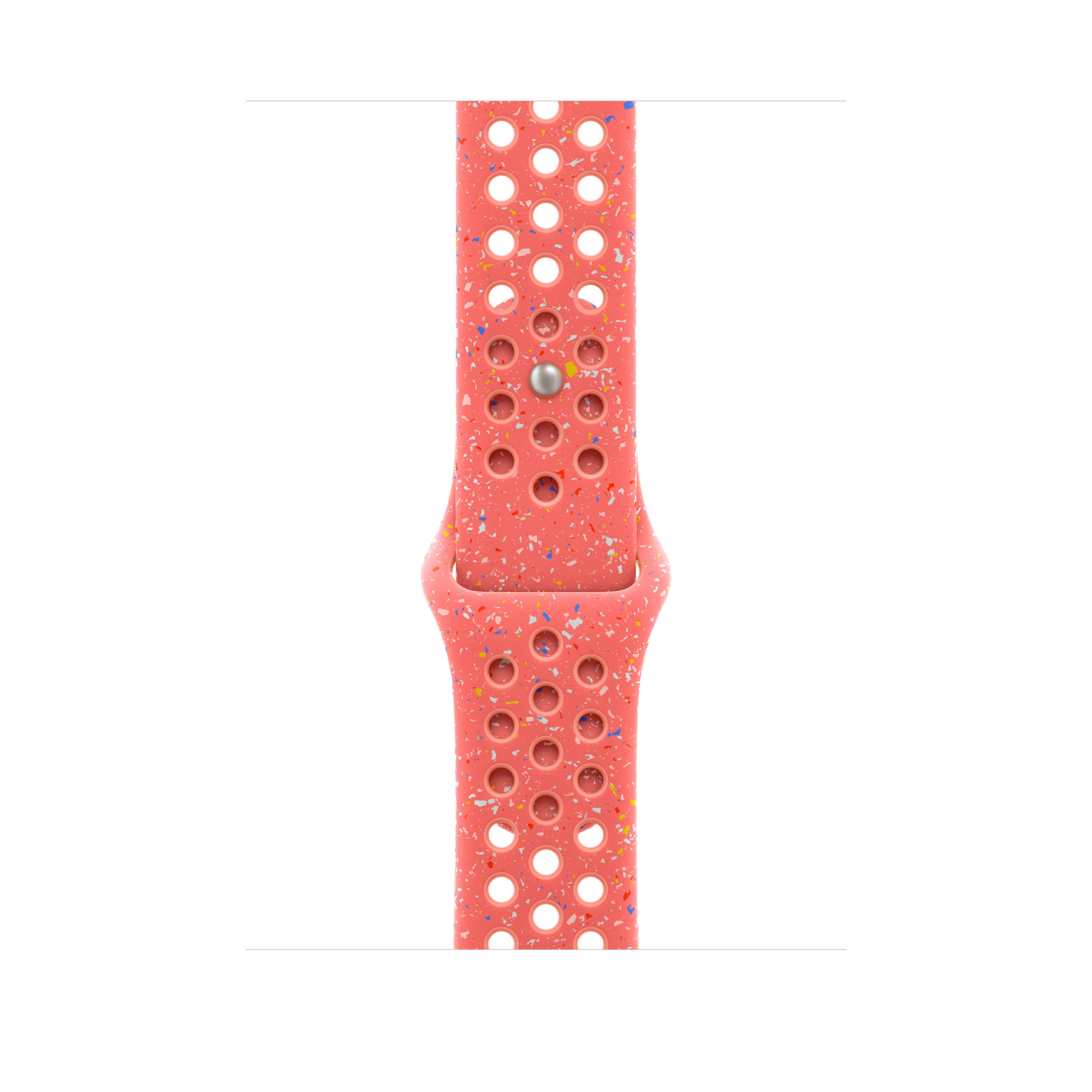 La correa Nike Sport es resistente y suave a la vez. Además, es transpirable gracias a sus perforaciones hechas por compresión. Incluye fragmentos de distintos colores que se combinan de forma aleatoria para crear un diseño jaspeado único. Este material es flexible, agradable al tacto y se adapta con elegancia a tu muñeca. Su nuevo cierre de clip de aluminio da al pasador un elegante acabado mate. La correa contiene al menos un 32 % de fluoroelastómero reciclado y las motas del jaspeado, al menos un 66 %.